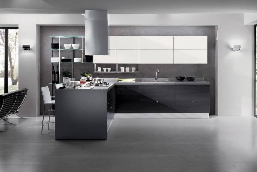 Кухня наполнена светом, цвета монохромные, с небольшими вкраплениями ярких оттенков. Вся мебель простых форм, без изысков. Квадратные, прямоугольные поверхности придадут помещению строгость и изящество.
