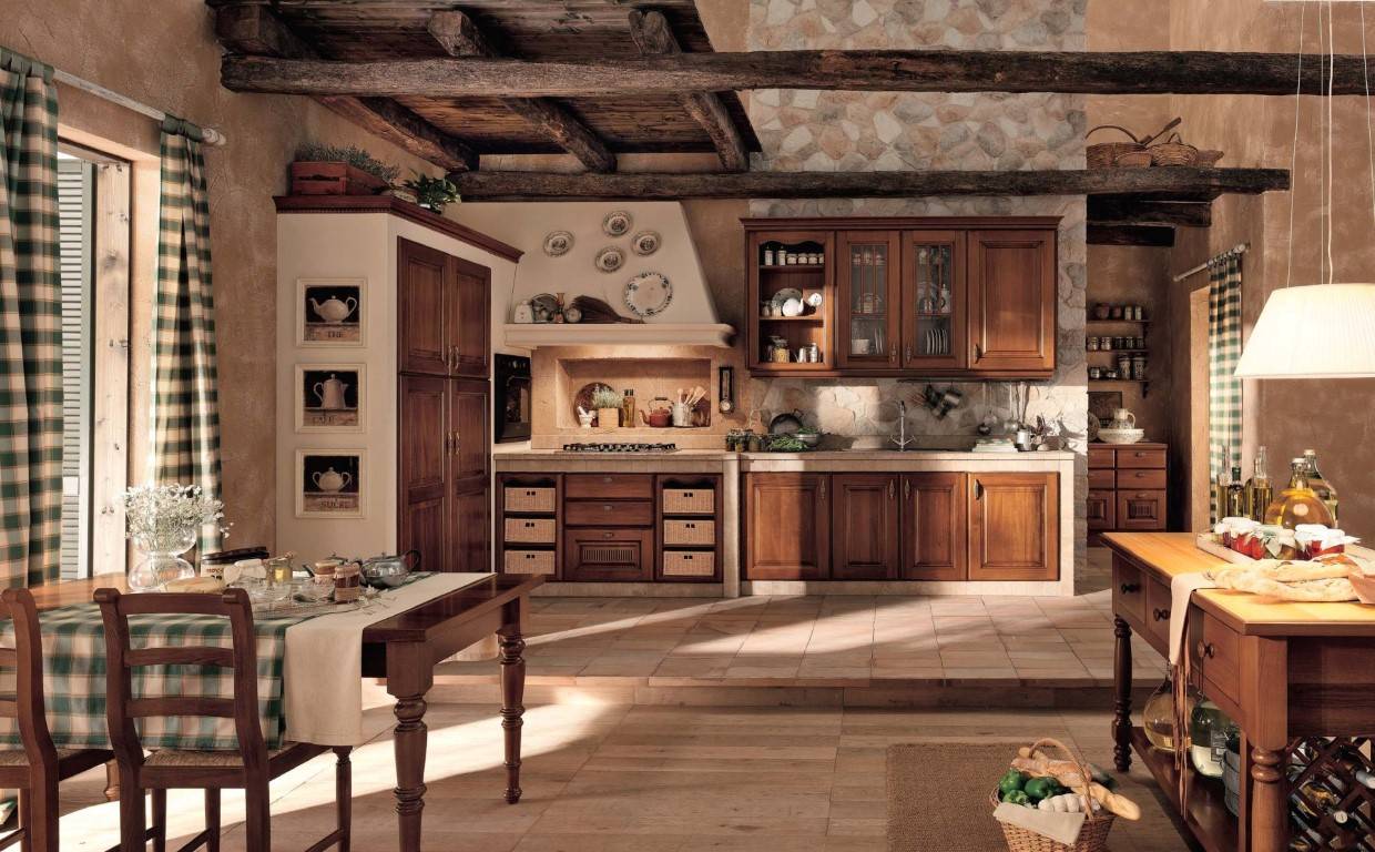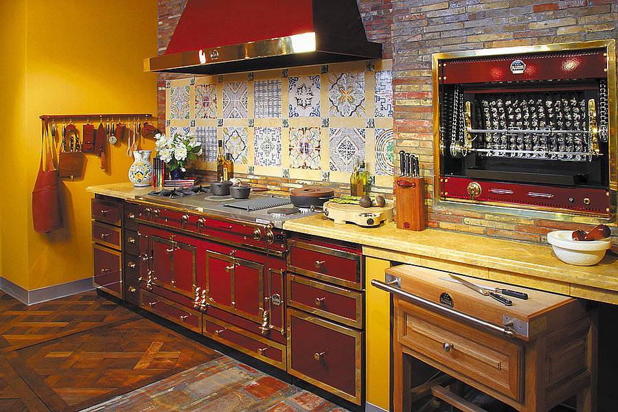 Его характеризуют просторные кухни, обставленные массивной деревянной мебелью с медными или чугунными ручками, большой многофункциональной плитой и столом внушительных размеров посередине.