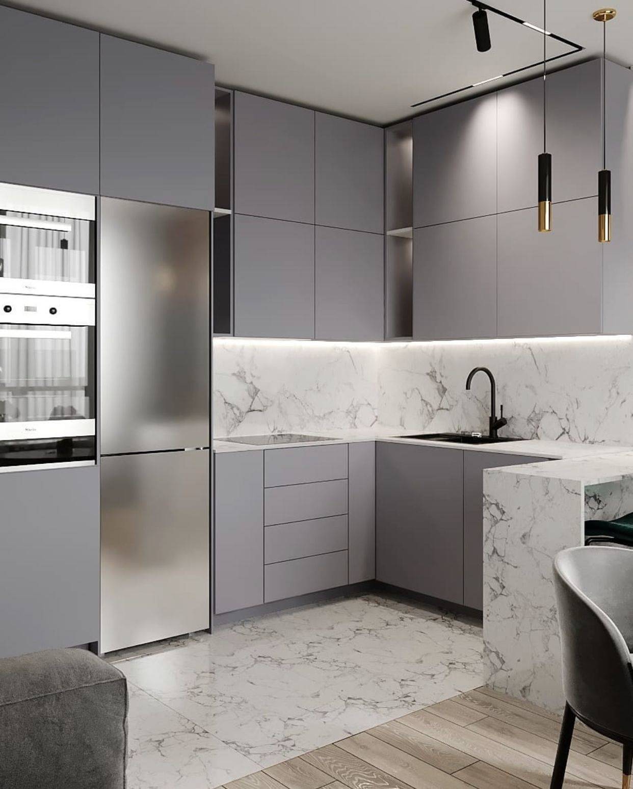 Серый п-образный кухонный гарнитур