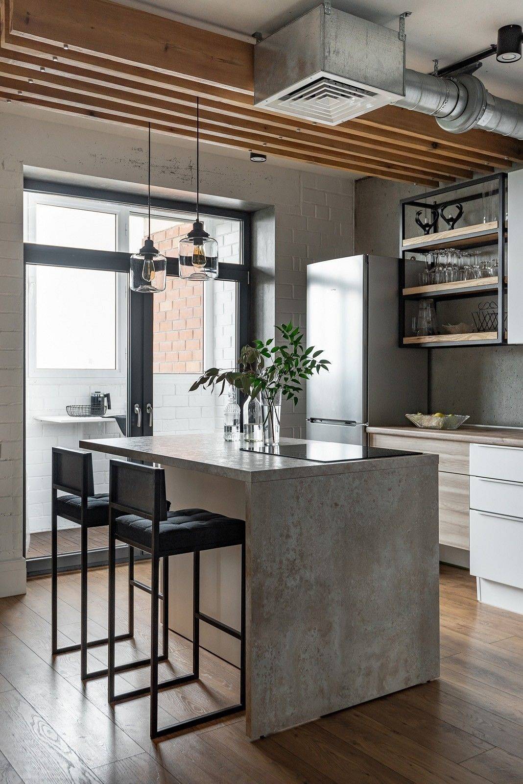 Кухня 8 метров с дизайном, как на фото, в стиле лофт предполагает использование некрупных и лёгких предметов мебели. Декор здесь максимально сдержан и несколько брутален. Акценты, имеющие фактуру натурального дерева, станут наиболее гармоничным дополнением.