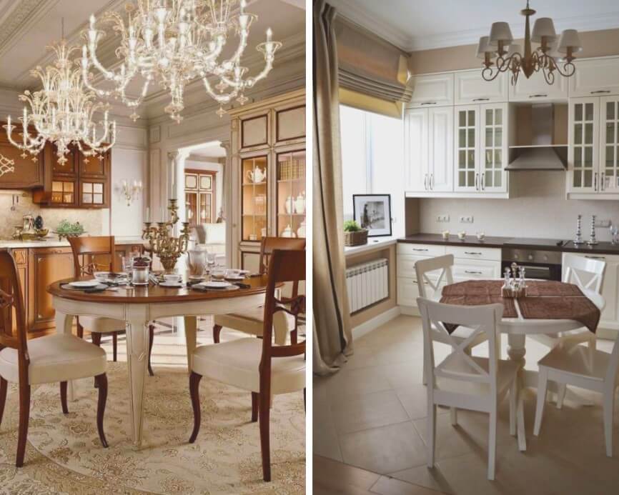 Небольшая или маленькая кухня, оформление которой выдержано в классическом стиле, требует отделения рабочей зоны от столовой, где можно разместить небольшой, но достаточно презентабельный стол.