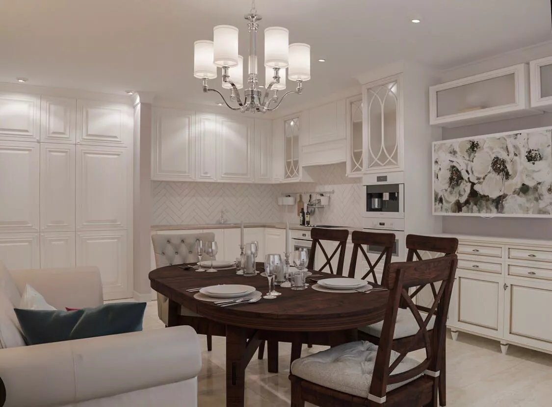 Классические кухни 2023 в основном оформлены в светлых тонах. На пике популярности теплые оттенки белого, такие как кремовый и слоновая кость.
