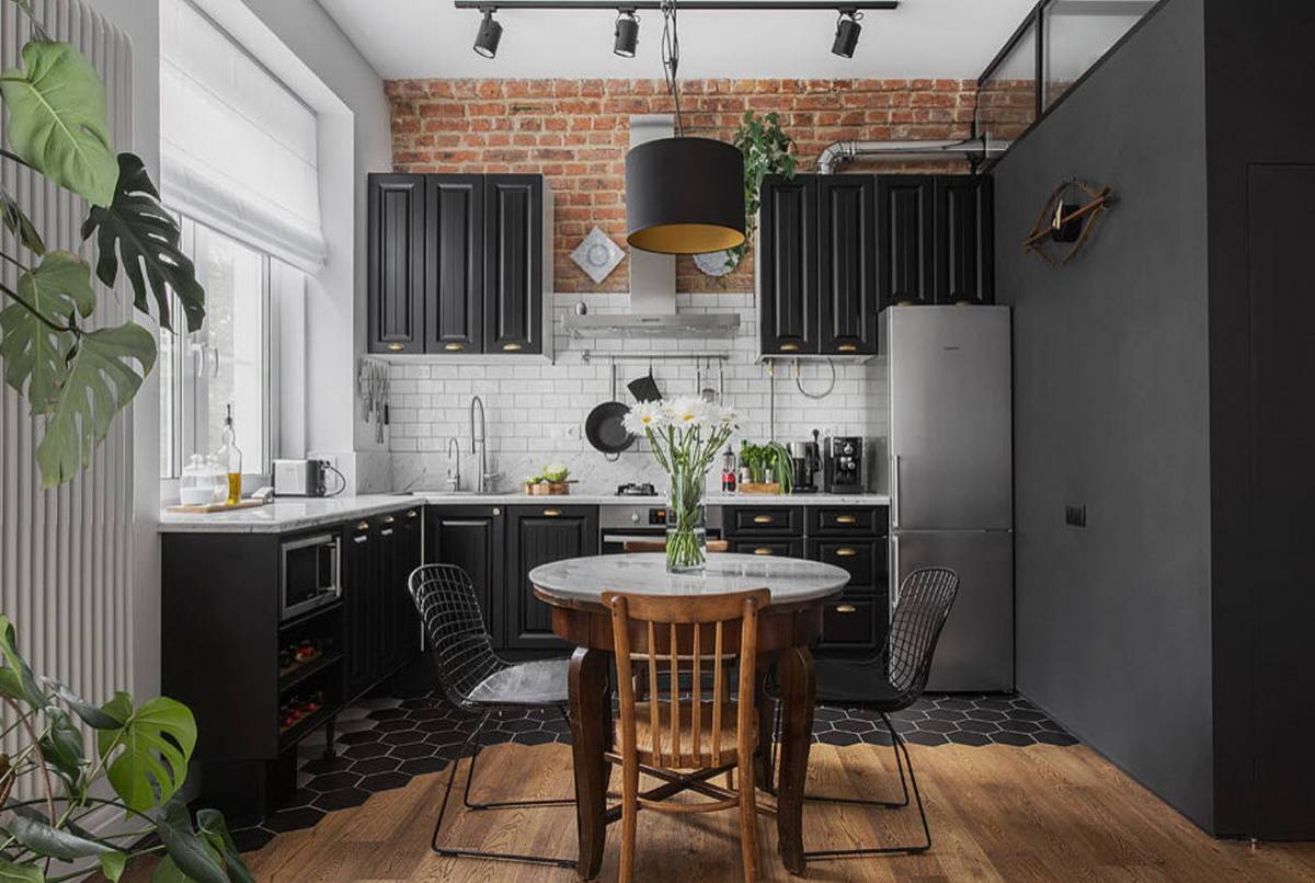 Интерьер в стиле Лофт может включать фартук с имитацией светлого кирпича, контрастную отделку одной стены, креативные осветительные приборы. Внешний вид фасадов может быть разным, главное, чтобы в помещении создавалась атмосфера арт-пространства.
