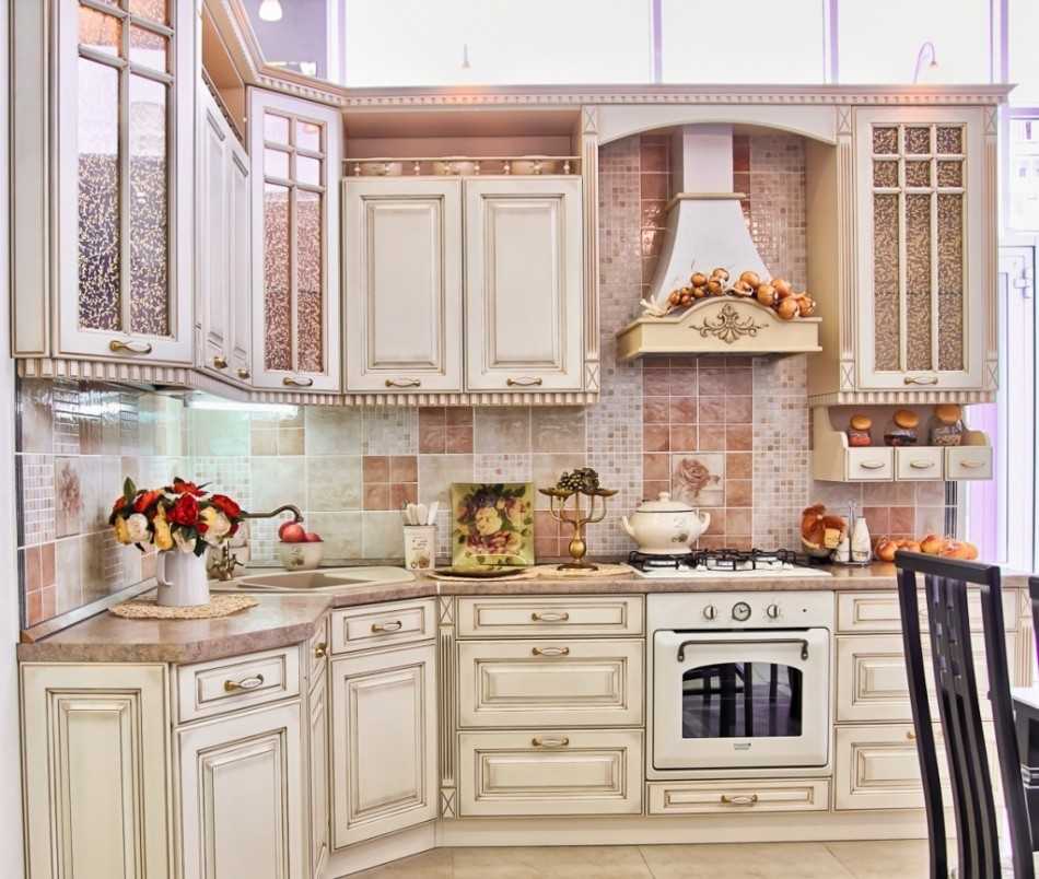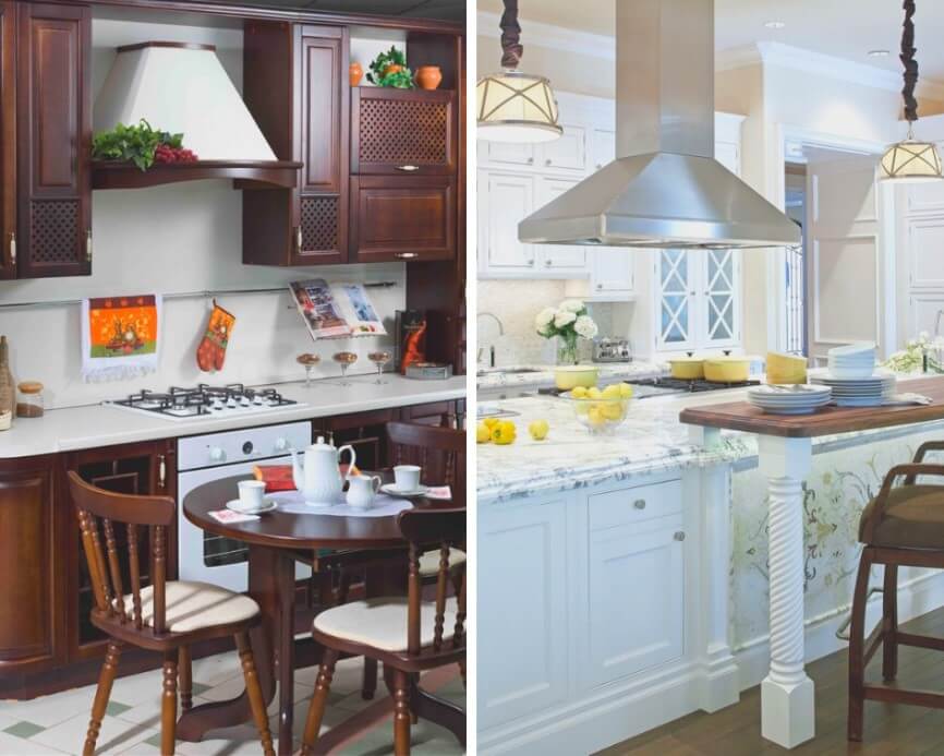 Особого внимания требует вытяжка. Чтобы она гармонично вписалась в общий декор необходимо приобретать ее с колпаком, стилизованным под Классику или спрятать за навесной дверцей кухонного гарнитура. Второй вариант немного дешевле, да и рабочая зона будет выглядеть очень компактно. Иногда можно подобрать вытяжку нейтрального внешнего вида, которая не будет конфликтовать с общим интерьером кухни-столовой.