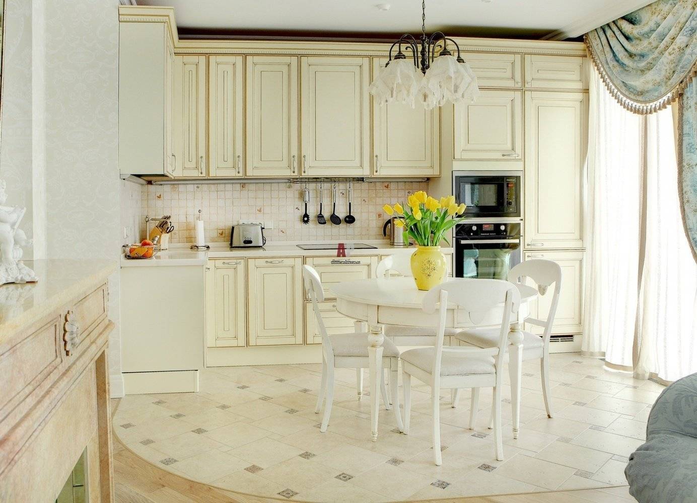 Ламинат — бюджетная альтернатива паркету. Внешне он может имитировать дерево как светлых, так и тёмных пород. Износоустойчивые модели ламината высокого класса не боятся уборки влажной тряпкой, механических повреждений. Дизайн светлой кухни в стиле классика можно увидеть в фотогалерее.