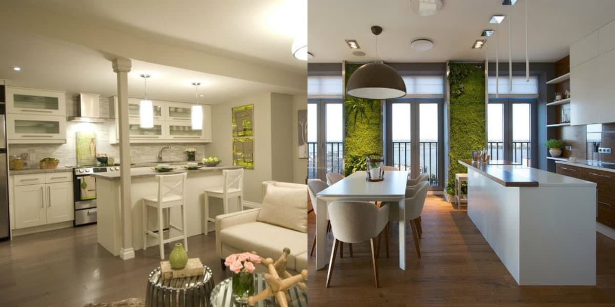 Этот прием, известный еще древним грекам и римлянам, широко используется в современной классике. Кухня, столовая и даже уютный уголок для послеобеденного релакса – в одной комнате. Легкие деревянные перегородки, многоуровневое освещение, эргономичные предметы интерьера — результат приятно радует.