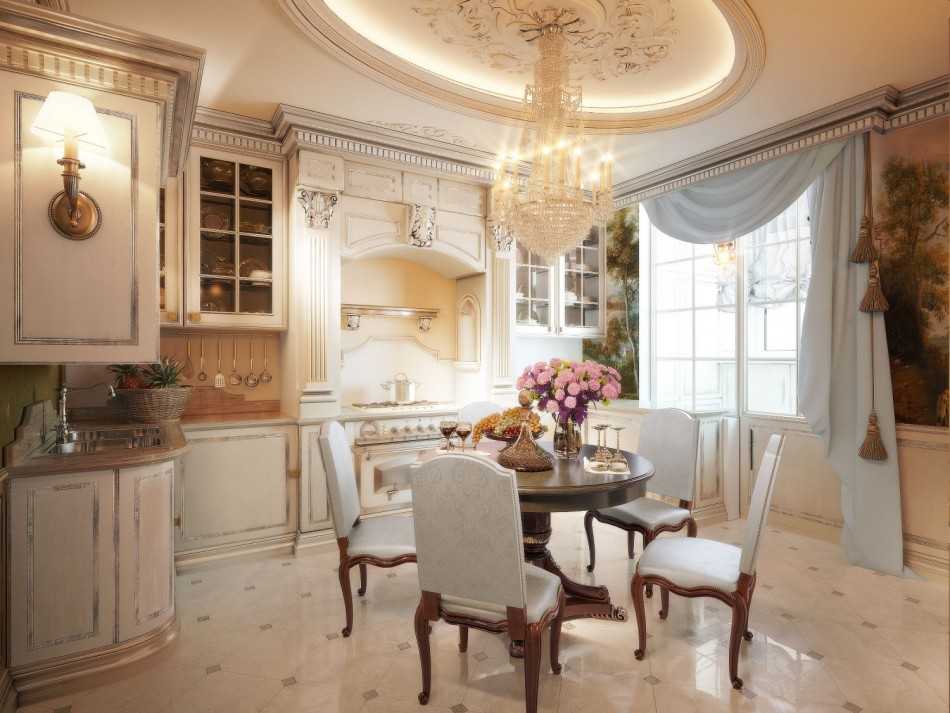 Стены кухни в классическом стиле изысканно украсит лепнина