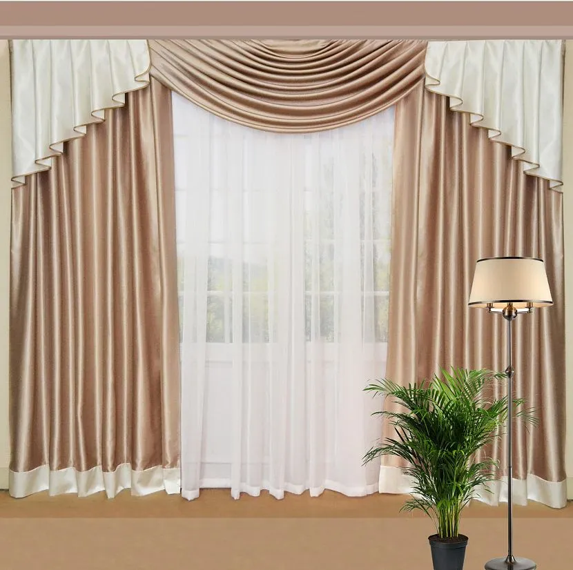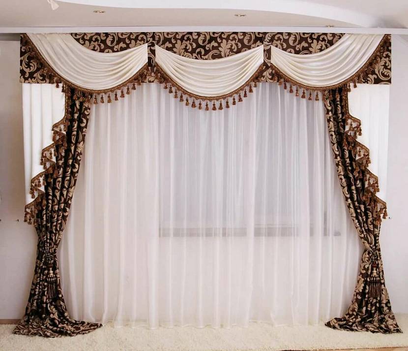 Шторные композиции шьют с мягким или жестким ламбрекеном. Иногда обходятся только декоративными элементами – это сваги, веера, каскады, жабо.