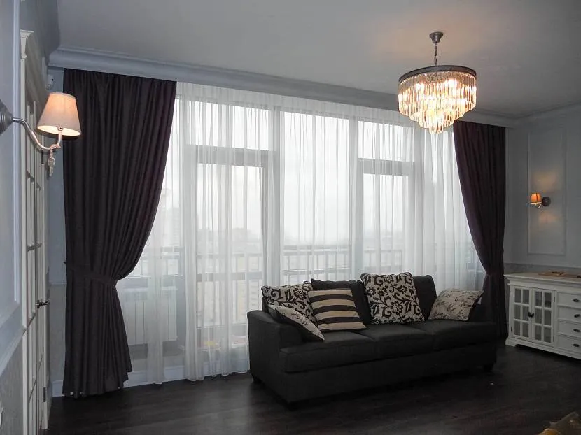 Зашторивающиеся на ночь полотна плюс легкая занавеска из полупрозрачного тюля – это классический стиль в чистом виде.