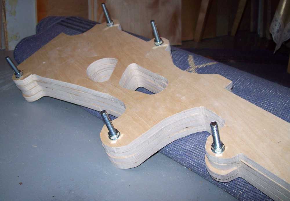 - Фуганком формируется ус по длине 10-12 толщин фанеры, чтобы обеспечить максимально качественное прилегание, а затем струбцины снимаются;