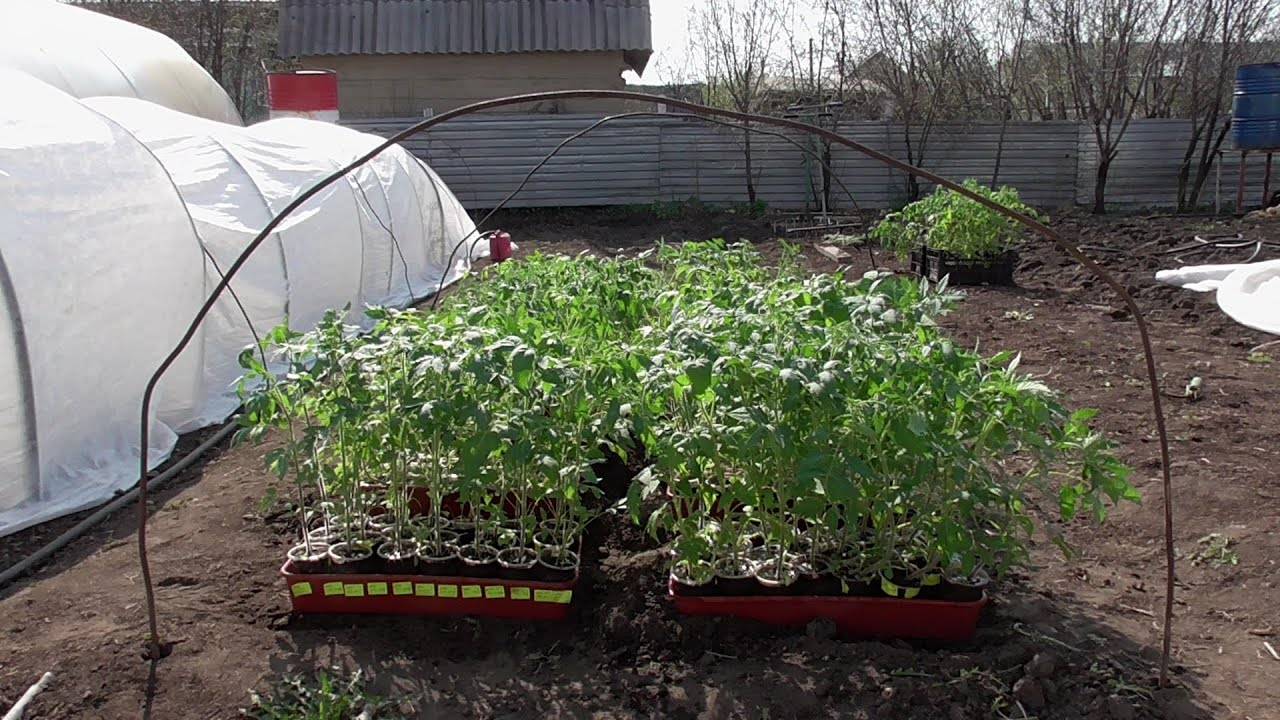 Старинных примет о высадке тепличных культур, конечно, не существует. Поэтому тут приходится ориентироваться на градусник. В первой декаде мая можно уже рискнуть и перевезти на постоянное место жительства несколько томатов. Но лучше подождать, пока почва прогреется хотя бы до +10 на глубине 15-20 см. Тогда можно высаживать томаты, перцы и баклажаны. Сквозняков в теплице быть не должно. Для предохранения рассады и от замерзания ночью, и от солнечных ожогов днём, спасают наполненные водой полуторалитровые пластиковые бутылки. Дня за два до переезда томатов на дачу надо отломить нижние пожелтевшие листья, оставшиеся пенёчки успеют подсохнуть до высадки.