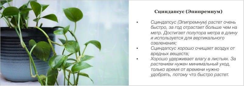 Следующий популярный вид – это эпипремнум (сциндапсус золотистый). Его также относят к разряду очищающих воздух и неприхотливых растений, а значит подходящих для кухни. В отличие от первых двух кухонных комнатных растений, сциндапсус – это вечнозеленая тропическая лиана, вырастающая до 1,5 м в длину.