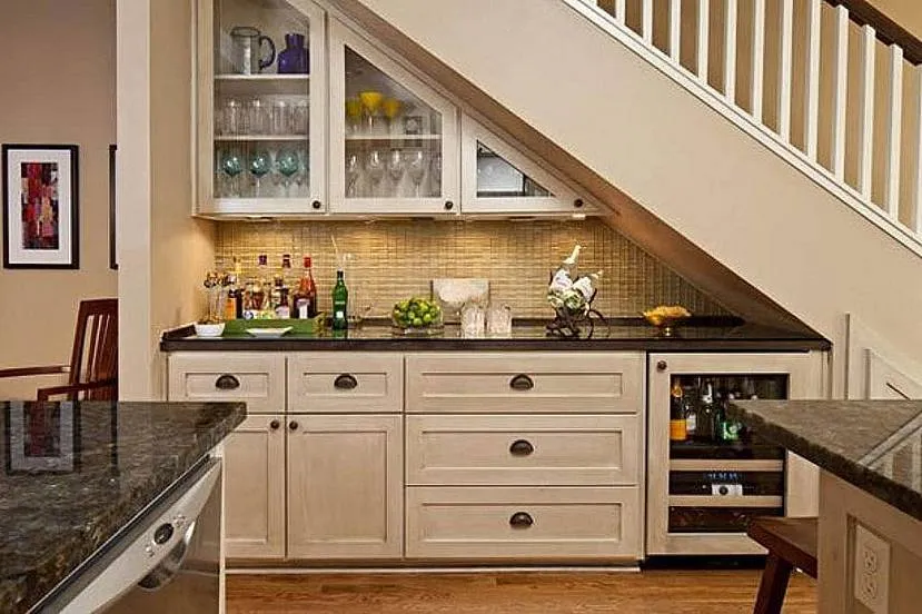 Если лестничный марш находится на кухне, то участок можно обустроить под бар. В нише монтируют стеллаж с множеством полок, на котором размещают открытые алкогольные напитки. Закупоренные емкости ставят в отдельные отсеки. В зоне устанавливают высокие стулья и стойку или небольшой диванчик со столиком.