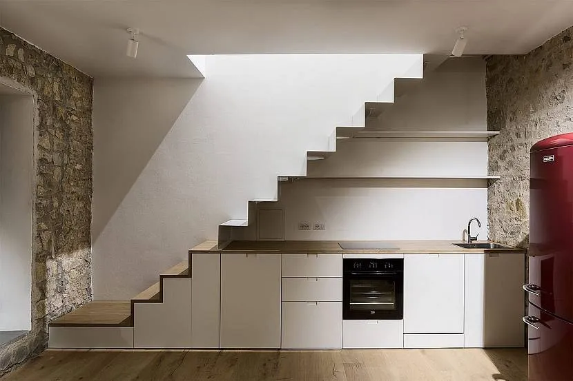 Если в область под лестницей провели коммуникации, то можно обустроить кухню. В зависимости от размеров марша, гарнитур ставят углом, в линию или в форме П. Рабочую зону с мойкой располагают на комфортной высоте. Вместо стандартного холодильника дизайнеры рекомендуют установить малогабаритную модель и отдельную морозильную камеру.