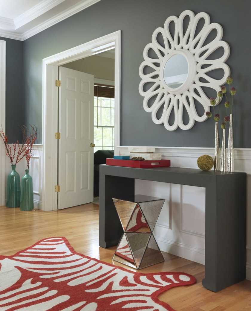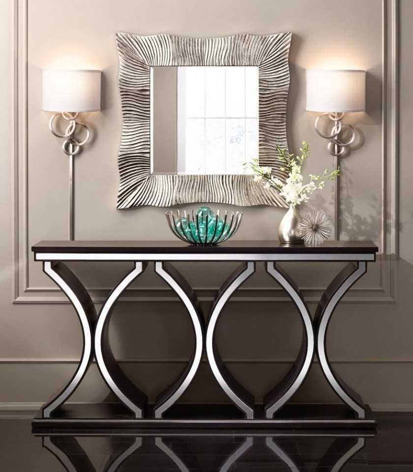 Если над консолью располагается зеркало, его рама должна соответствовать декоративному оформлению стола. В этом случае данный тандем будет настоящим украшением помещения. Консоль в прихожей может стать симметричным центром, если ее дополнить с обеих сторон одинаковыми бра, подсвечниками или вазами.