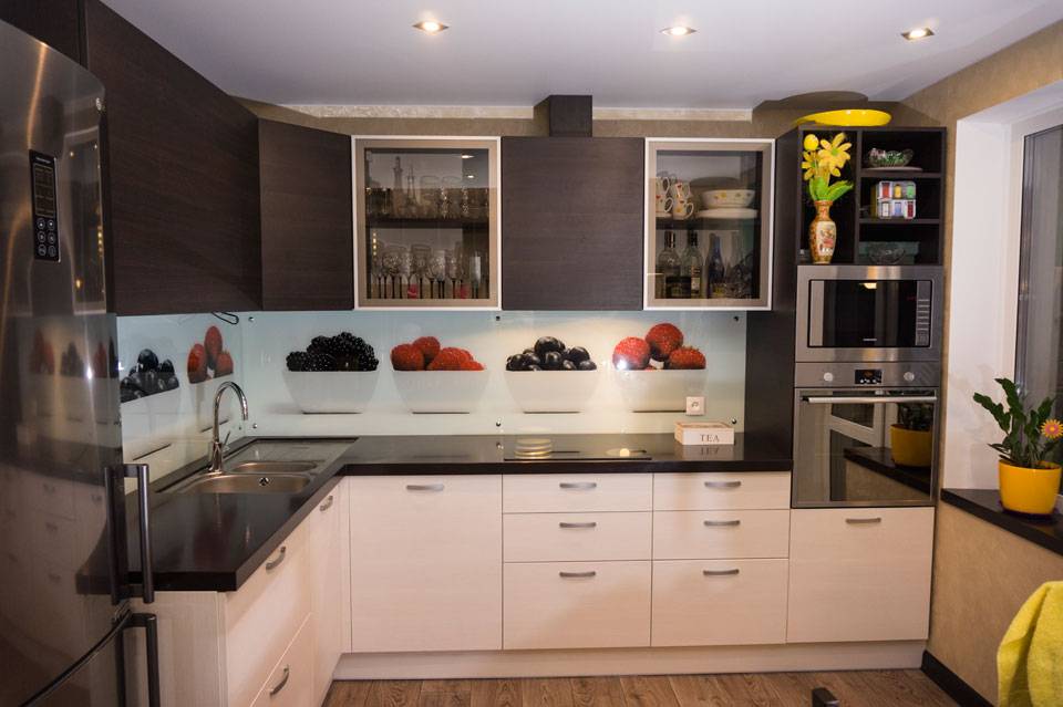 Подойдут для подчёркивает нижней линии оттенки близкие к тёмному шоколаду. Лёгкость верху придаст цвет кремовый или слоновая кость. Если добавить в дверцы шкафчиков витражные или затемненные матовые стекла, интерьер становится интереснее.