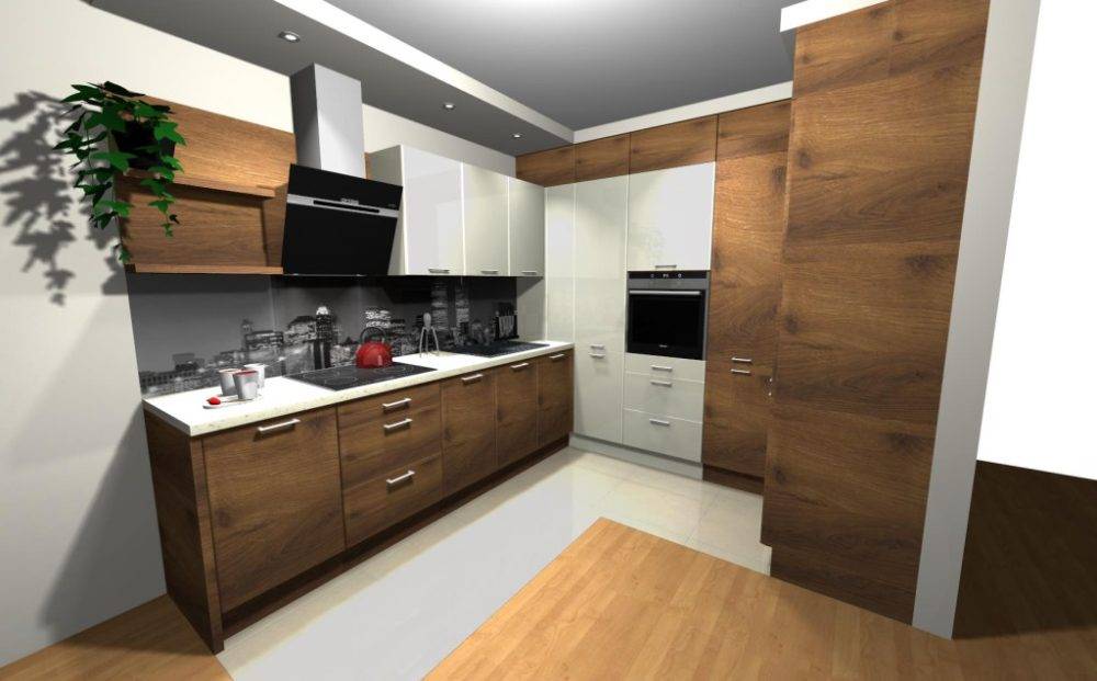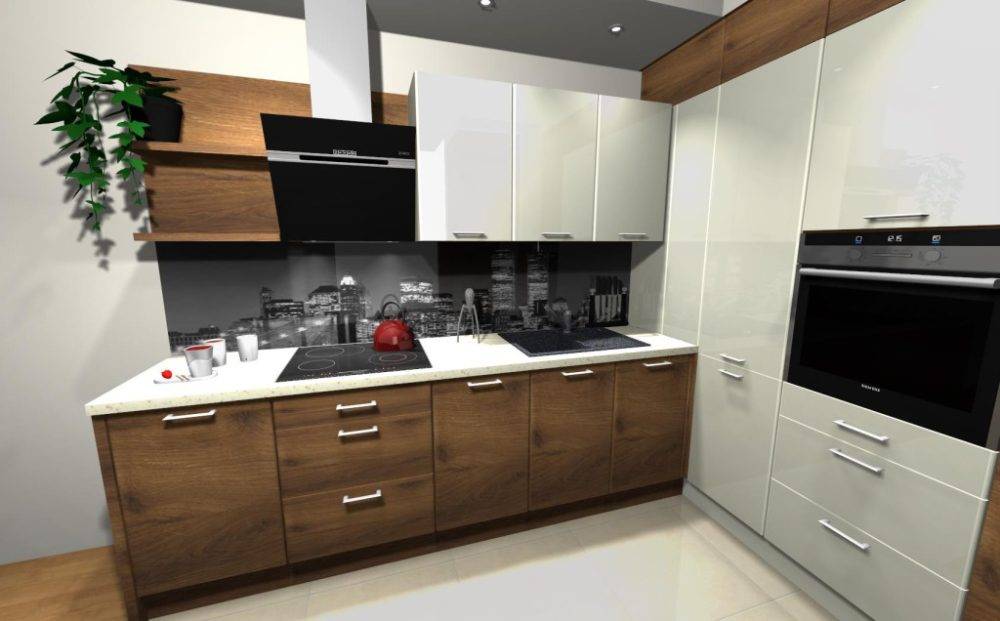 контрастное оформление дизайна: комбинирование коричневых и белых глянцевых фасадов в интерьере кухни