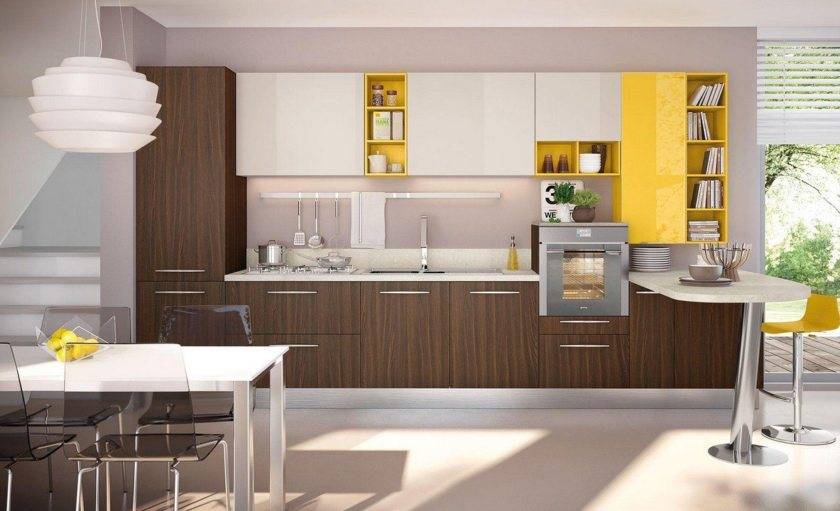 Коричнево-голубая кухня может создавать ощущение прохлады и свежести, а коричнево-оранжевая будет напоминать о ярком солнце и сочных красках осеннего леса.