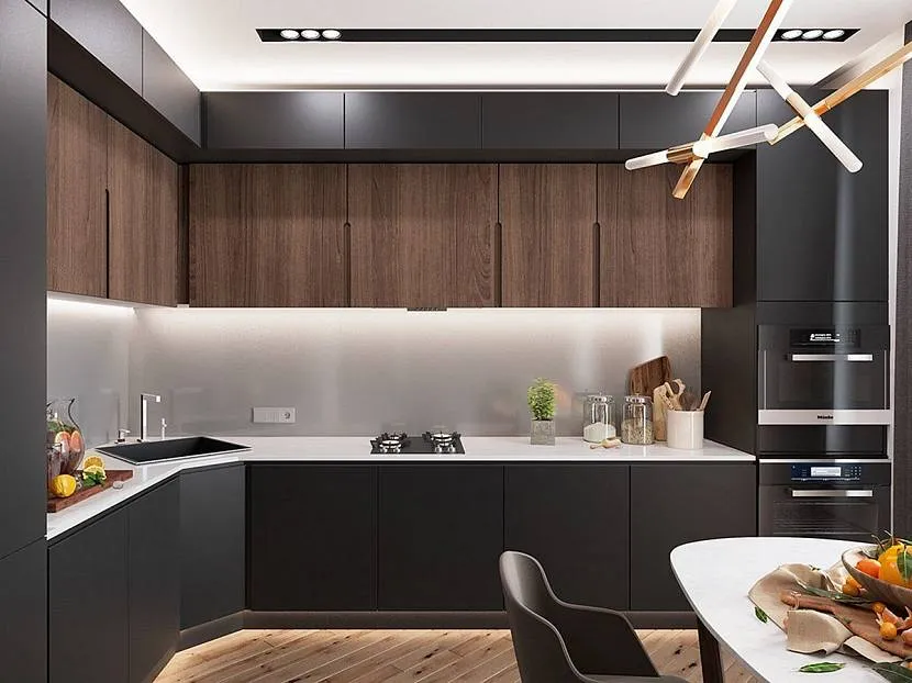 В данном случае чаще всего темно-коричневую кухню разбавляют пепельными тонами и металликом, что придает пространству строгости и в то же время роскоши. Также используются теплые бежевые оттенки в сочетании с серым.