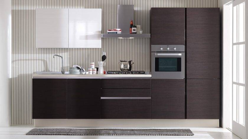 Черно-коричневая мебель с белыми фасадами и столешницей будет отличным дополнением к белоснежному фону стен.