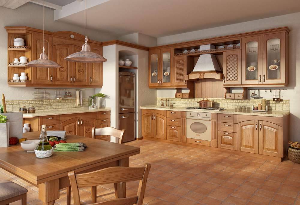 - Классическую кухню сложно представить без гарнитура цвета дерева. Мебель символизирует благородство и практичность. Для изготовления кухни используют мультиплекс или цельные массивы.