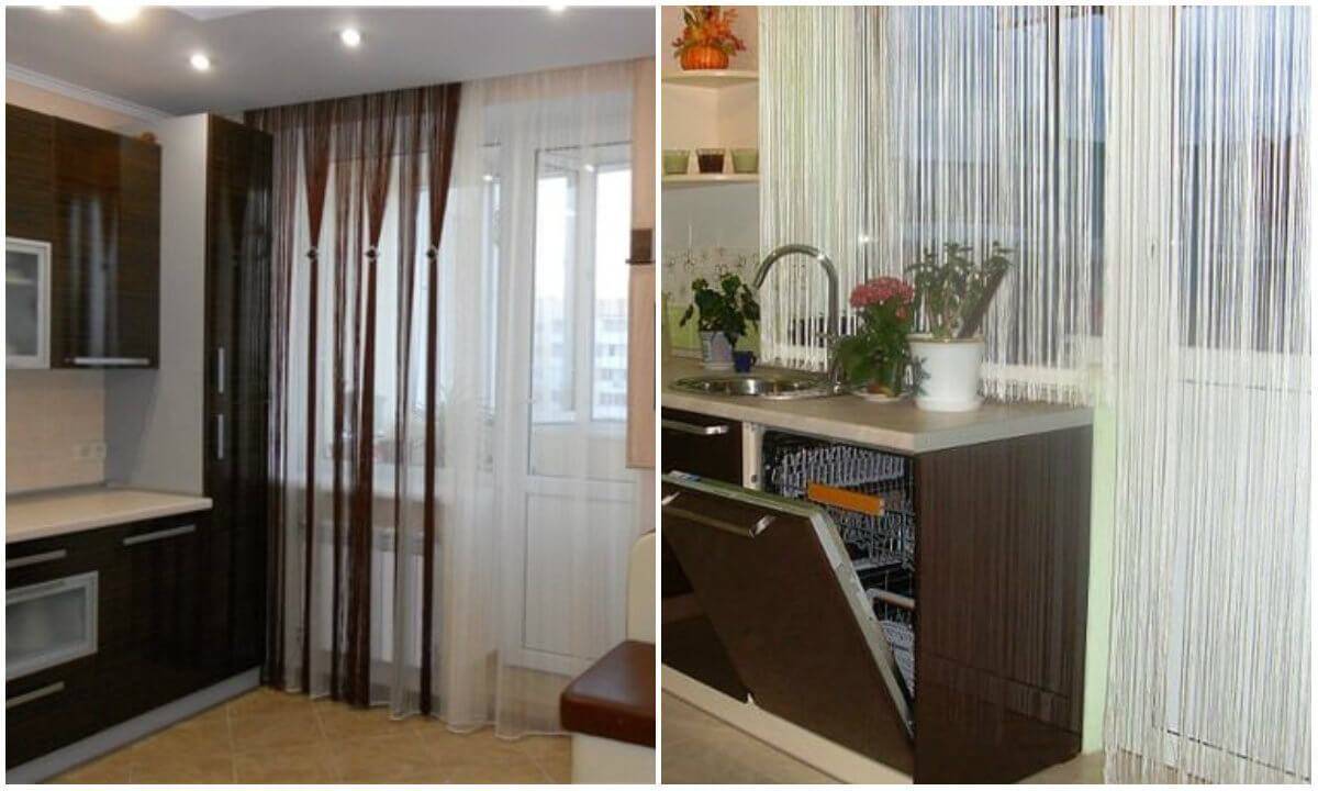 Ремарка: выбор штор на кухню с балконной дверью отличается — тут обычные длинные шторы в пол становятся рациональным выбором.