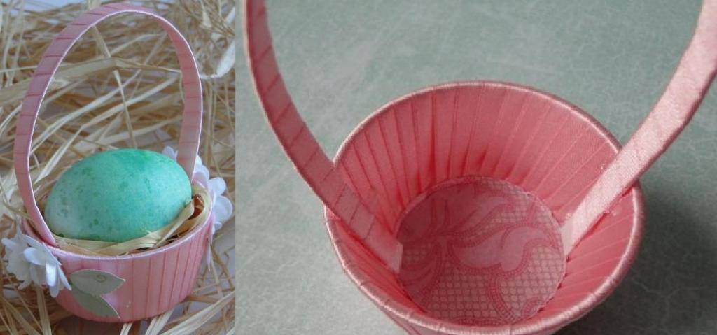 И еще одна интересная поделка также выполняется совсем несложно. Нужно лишь подготовить полоску картона. Длина ее равна длине окружности желаемой корзинки, а ширина, соответственно, ее высоте. После этого при помощи линейки чертим линию, отступив от нижнего края один сантиметр. Делаем на ней надрезы, не заходя за ограничитель. Затем скручиваем полоску и склеиваем два края. Нижние детальки аккуратно загибаем и также склеиваем друг с другом. Оставляем основу нашей будущей корзинки из картона и лент на несколько часов, чтобы она хорошо просохла. В это время можно подготовить донышко и ручку нужных размеров. Когда указанное время пройдет, берем атласную ленту понравившегося цвета и приклеиваем кончик с внутренней стороны. А потом начинаем обматывать боковые стороны нашей корзинки. Оформив таким образом всю основу, отрезаем лишнюю часть ленты и приклеиваем кончик с внутренней стороны. Далее обматываем подготовленную ручку, прикрепляем также изнутри и кладем в корзинку донышко.