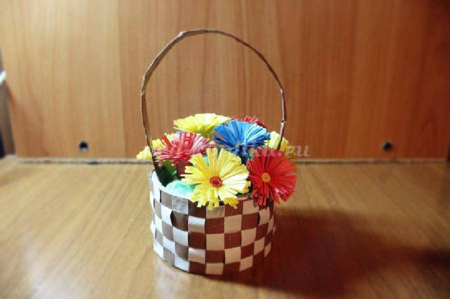 Смастерите ручку, переплетя бумажные ниточки косичкой. Хвостики также спрячьте внутри и подклейте. Корзинка готова! Можно украсить ее цветочками как на фото.