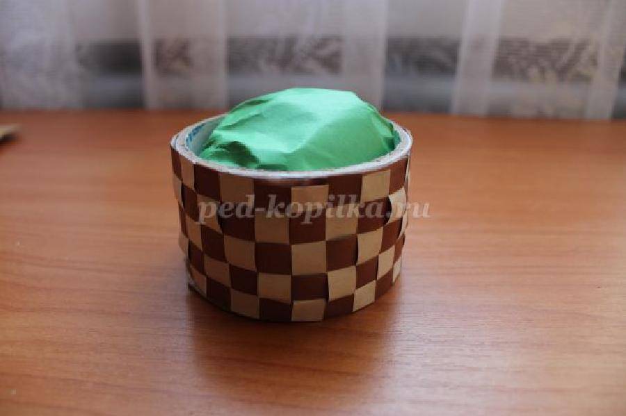 При желании кромку корзины можно выполнить бумагой другого оттенка или оформить тканью. Следите за тем, чтобы переплет шел равномерно, стенки оставались параллельными, а донышко не перекашивалось. Для этого пинцетом регулируйте силу натяжения элементов.