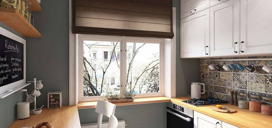 Избавьтесь от громоздкой мебели. Подумайте о возможности расширения подоконника, возможно, сложной формы. Это дополнительная полка, рабочая поверхность или обеденный стол.