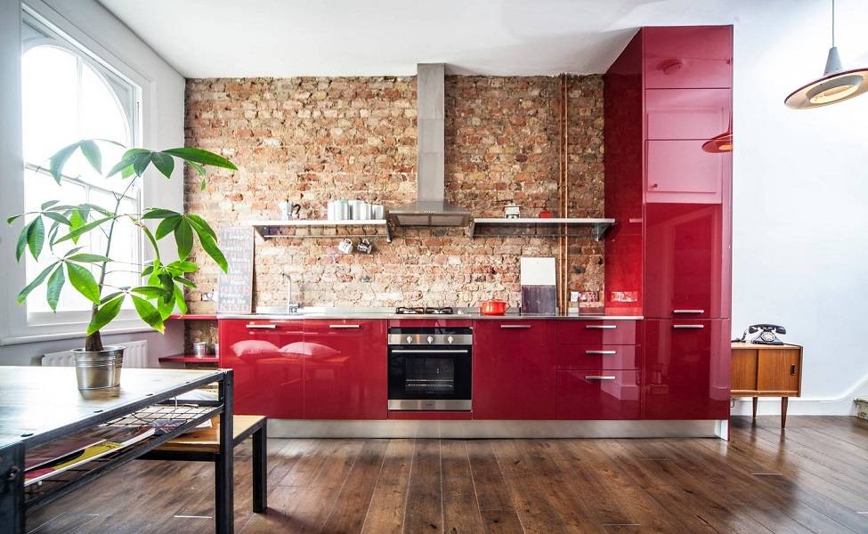 Подходящее сочетание для стилей лофт и прованс. Предпочтительнее не глянцевые, а матовые фасады. Дизайн кухни в красном цвете на фото может выглядеть привлекательно, но в жизни обилие теплой гаммы, усиленной бликами, будет создавать угнетающую обстановку. Отлично подойдут такие элементы, как нарочито грубая кирпичная кладка, старое дерево, оголенная штукатурка.