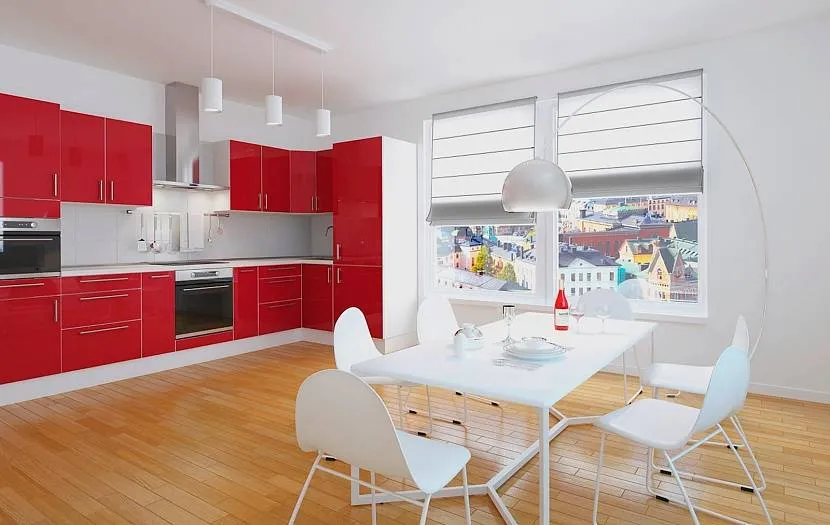 Особенно, если кухня имеет ориентацию на солнечную сторону, лучше использовать портьерную ткань. Для первых этажей актуальны полупрозрачные красные ткани, не мешающие естественному освещению, одновременно скрывающие личное пространство от чужих глаз.