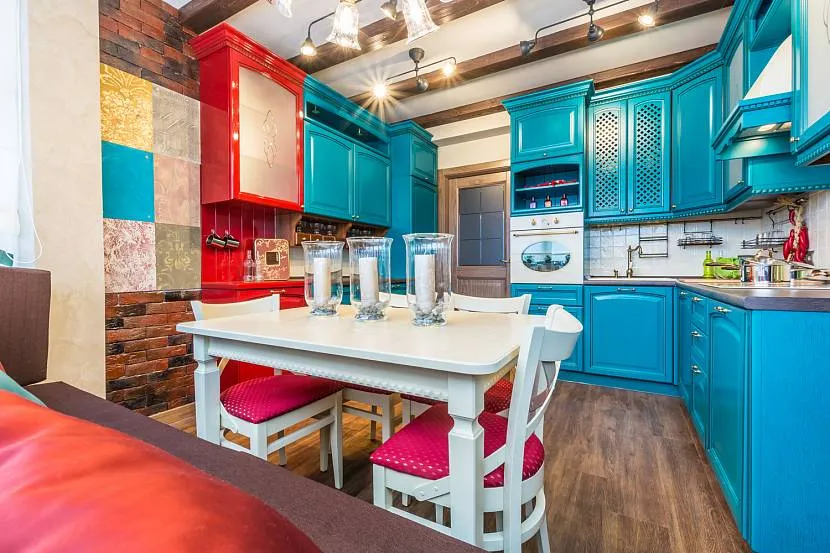 Кухня бирюза с краснымИсточник peredelka-kvartiry.ru/