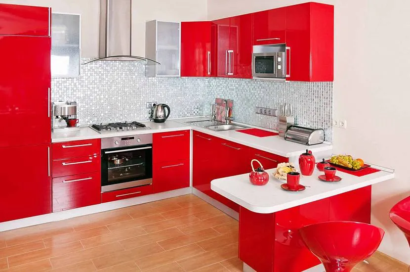Минимально красный используют в маленькой кухне, так как он способствует визуальному расширению и приближению стен. Мебель и декорирование красного цвета кажутся массивнее, поэтому просторное помещение с такой отделкой покажется тесным.