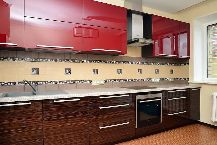 - кухонный гарнитур красный низ, бежевый верх с фурнитурой или декором чёрного цвета;