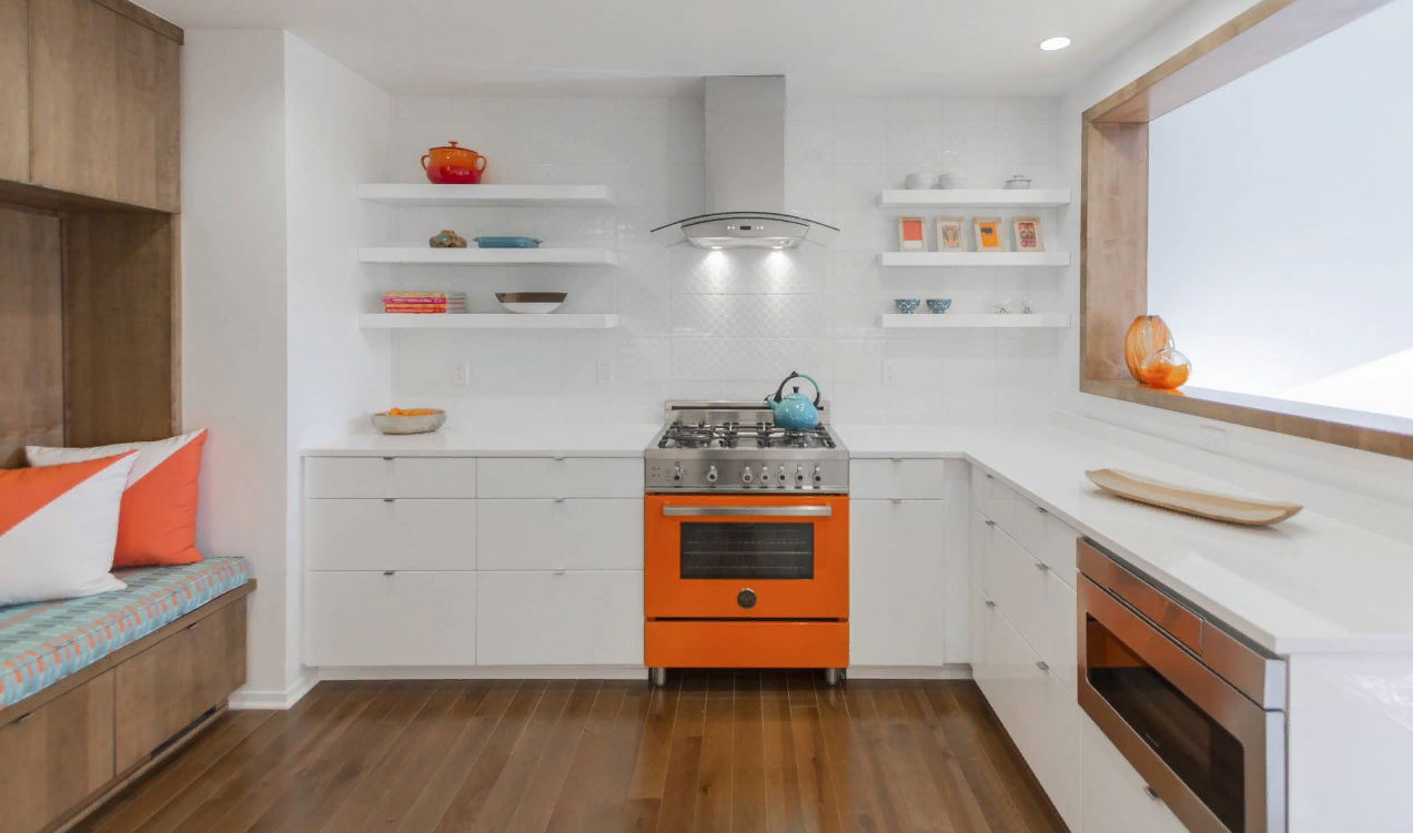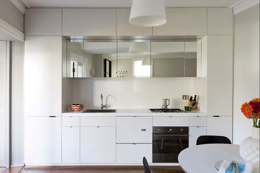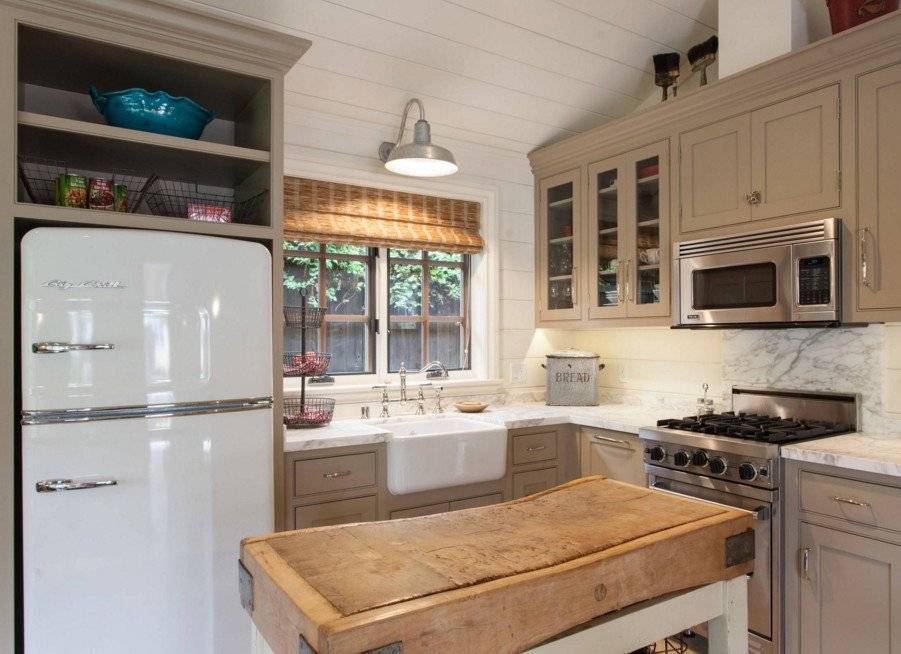 Думаете, шкаф больших размеров нельзя поместить в мини-кухне? А вот и нет! Вся фишка в том, что нужно правильно организовать его конструкцию.