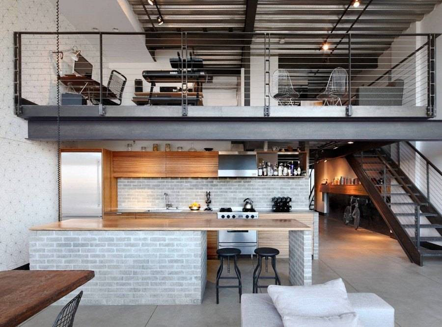 Индустриальная стилистика лофт характеризуется кирпичными стенами, обилием металла, необработанными поверхностями и открытыми инженерными коммуникациями. Оформление кухни-гостиной отличается лаконичностью, небрежностью и неформальностью.