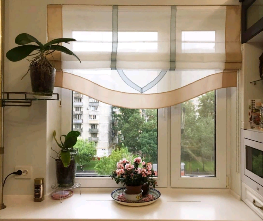 Маленькая кухня не должна иметь массивных занавесок, декорированных драпировкой и вставок. Выбирайте короткие шторы из полупрозрачного материала. Уместно использование римских и рулонных штор, а также жалюзи.