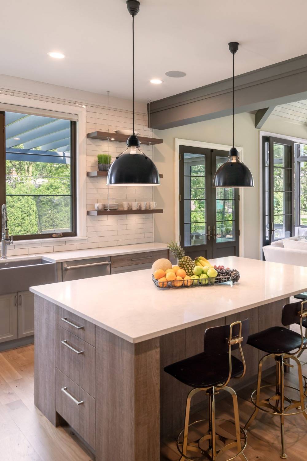 Островки и полуострова из столешницы или барной стойки. Они не только делят помещение на две зоны, но и служат дополнительной рабочей зоной или местом быстрого одиночного приема пищи (завтрака). Кроме этого, такая планировка прекрасно вписывается в дизайн большой кухни-гостиной в частном доме.