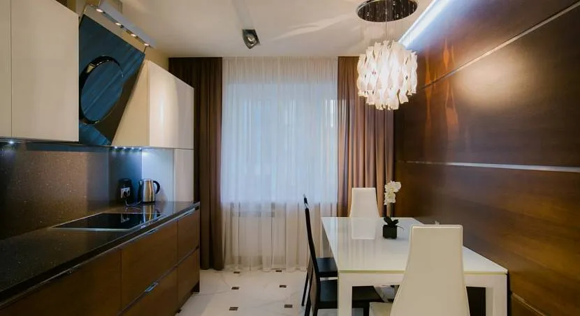 Конечно же это светлые оттенки, стен и потолка, они создадут полотно, на котором потом легко рисовать «картину» интерьера темными «красками» — другими элементами интерьера. Среди которых контрастного цвета фасады и столешница кухонного гарнитура, стол, занавески и другие атрибуты украшающие интерьер.