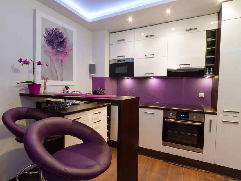 Для лаконичного пространства выбирают раскладную мебель, малозаметные узоры и желательно однотонную отделку. Органично будет смотреться такое оформление с аналогичным диваном — детали интерьера и обстановка в одном цвете всегда кажутся одним целым. В процессе ремонта кухня может стать лишь частью общей обстановки, но все же можно выделить ей отдельный уголок и оформить рабочую зону немного иначе, чем остальную часть комнаты. Другой цвет стен поможет зонировать пространство, возможно, даже «спрятать» один участок от другого. Здесь всегда есть место фантазии и реализации дизайнерских концепций.