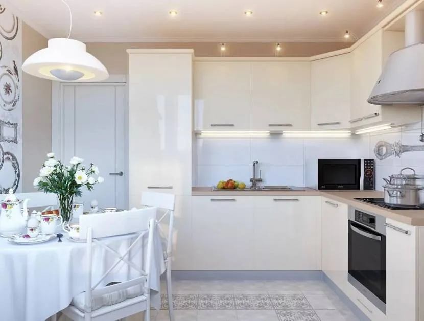 Белый цвет визуально расширяет пространство, создает ощущение чистоты, отражает солнечный свет и освещает всю кухню. Современный стиль идеально подойдет для планировки кухни 13 кв.м.