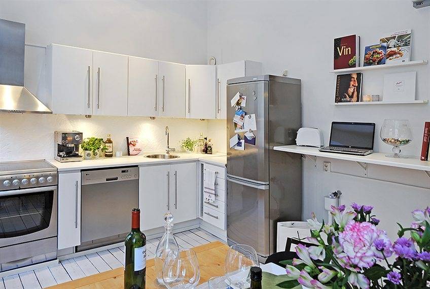 - Прямая кухня 3 метра с холодильником не позволяет вместить большую рабочую поверхность, поэтому иногда технику приходится переносить в другое место.
