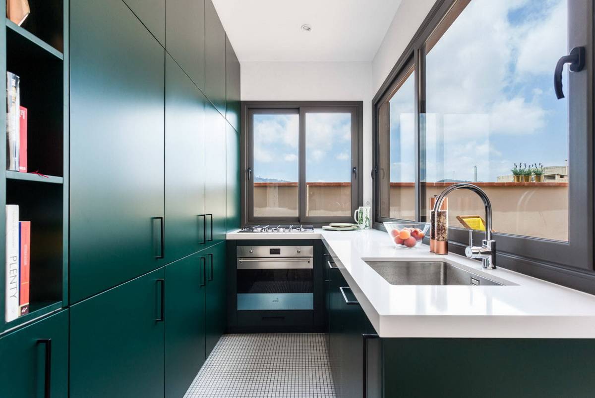 - Двухлинейная кухня станет хорошей заменой П-образной планировки в узком прямоугольном помещении.
