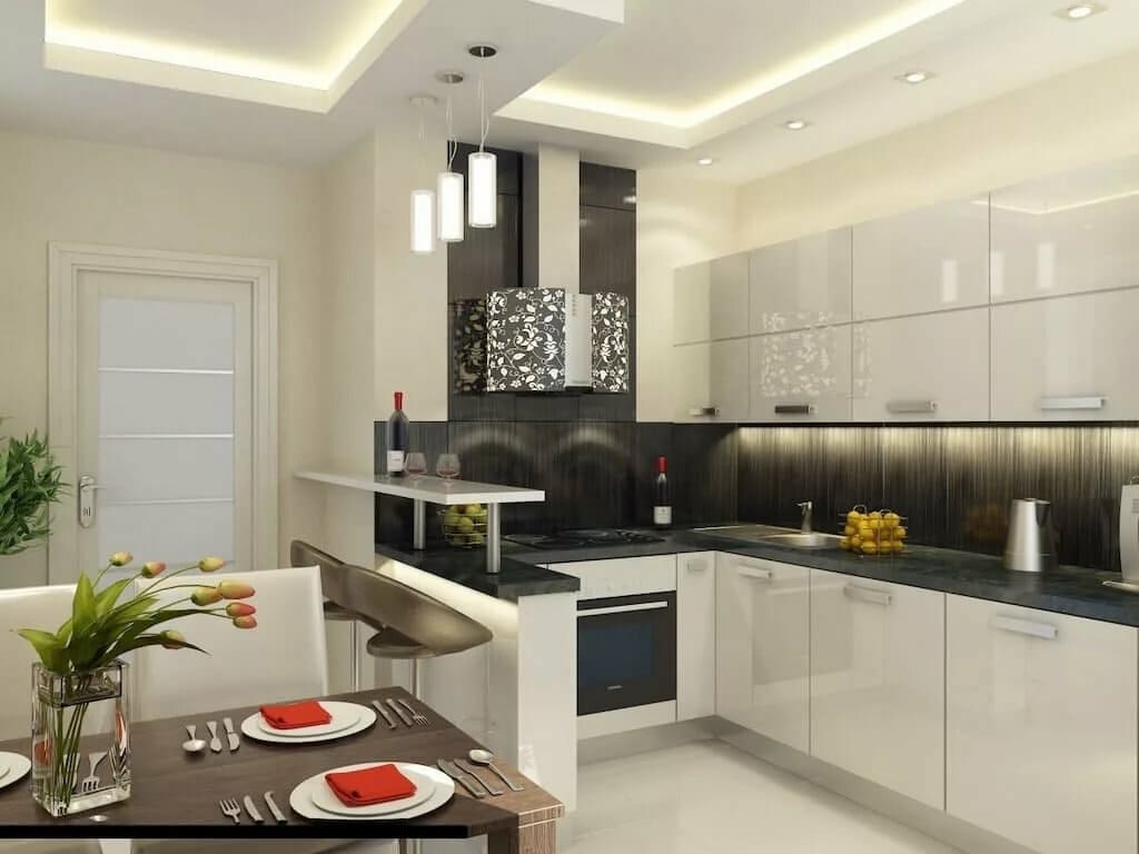 В дизайне кухни 12 метров можно воспользоваться стандартными типами планирования.