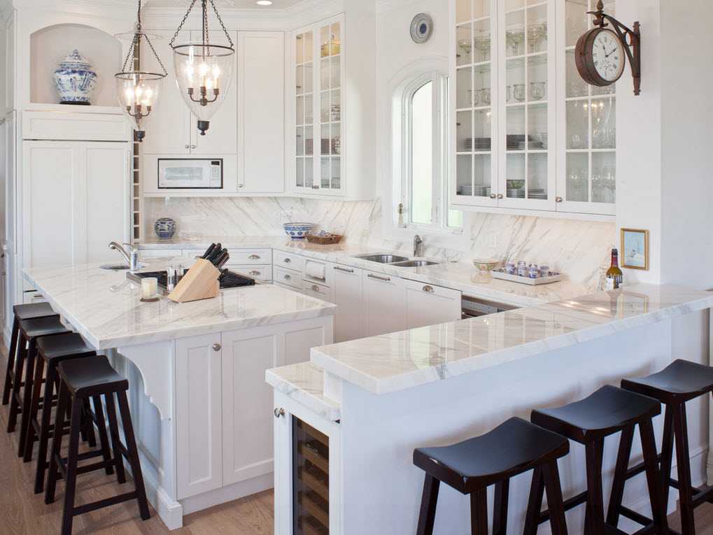 П-образная планировка также подходит для кухонь шириной более 2,4 метров и хороша тем, что задействует сразу два угла, позволяет готовить, совершая минимум передвижений. Но реализовать в типовой кухне такое решение будет несколько сложнее, ведь вам придется как минимум переделать подоконник, может быть приподнять уровень оконного проема (что возможно не всегда), а также обеспечить прохождение тепла от радиатора к окну. Как максимум вам потребуется перенести или удлинить коммуникации, если вы захотите перенести мойку к окну. Имейте в виду, что размещение плиты под окном запрещено. Что касается обустройства обеденной группы, то при П-образной планировке вы можете ограничиться лишь барной стойкой (она может быть частью буквы П), разместить компактную мебель или вовсе вынести ее в другую комнату, например, столовую или гостиную.