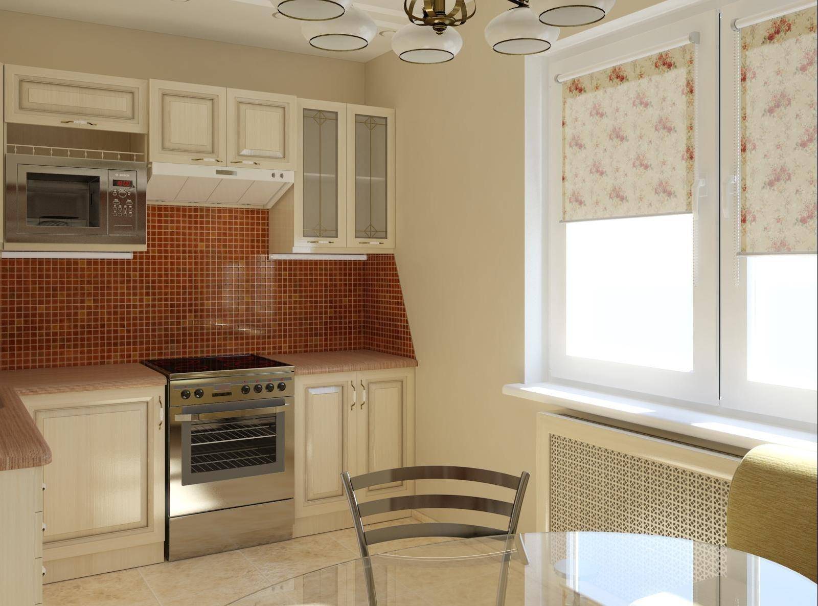 Главным атрибутом данного помещения является кухонный гарнитур, которому необходимо отдать должное внимание. Он должен включать в себя рабочее место для приготовления пищи и зону для обеда. Область под оком можно задействовать под установку разнообразных ящиков, тем самым увеличив подоконник и сэкономив лишние квадратные метры