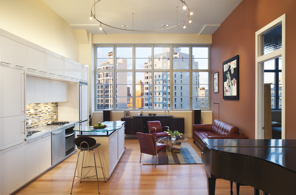 Индустриальные черты интерьера проявляются в видимом расположении труб, грубой отделке стен. Приветствуется множество осветительных приборов с простыми плафонами. Небольшие стеллажи смотрятся как стильный декор и являются системами хранения.