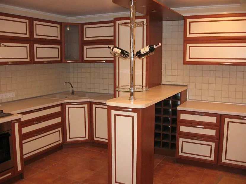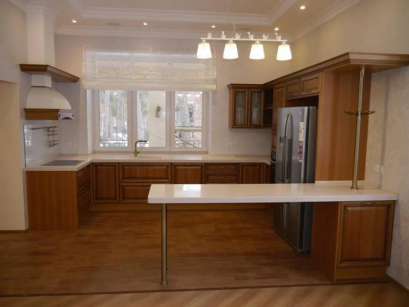 Дизайн углового гарнитура на кухне 16,5 кв.м в стиле кантри с барной стойкой от фабрики «Мария». Фасады МДФ с пленкой. Стоимость гарнитура — порядка 2400 долларов.