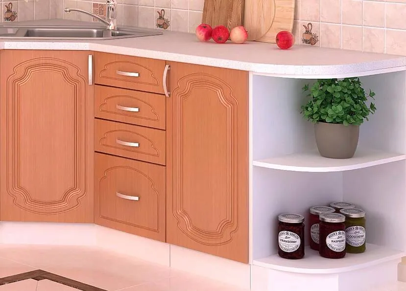 Такие углы очень вместительные, а также удобные, поскольку места перед мойкой или плитой гораздо больше. Одновременно недостатком станет сильно глубокий скошенный угол, что усложнит доступ к фартуку